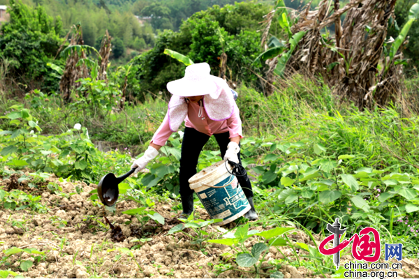 杜莫镇是荔浦市传统农业乡镇,各村结合实际,积极引导村民群众发展投资少、管理粗放、见效快的经济作物。上龙村岭地多、水源少,当地群众多以种植水果、玉米、黄豆、花生增加家庭收入。今年,通过果蔬合作社带动,群众利用黄化和废弃果园,退果还耕,大种南瓜。当前正是南瓜苗施肥育壮时节,在荔浦市微滕果蔬专业合作社南瓜种植示范基地,记者看到,10为工人有的在为南瓜除草、松根,有的正娴熟地把配制好的肥料进行稀释,再给每株瓜苗施以一定数量的水肥,一派生产繁忙景象。这些幼苗再过两个月后就可以陆陆续续成熟,定点对外销售走向市场。