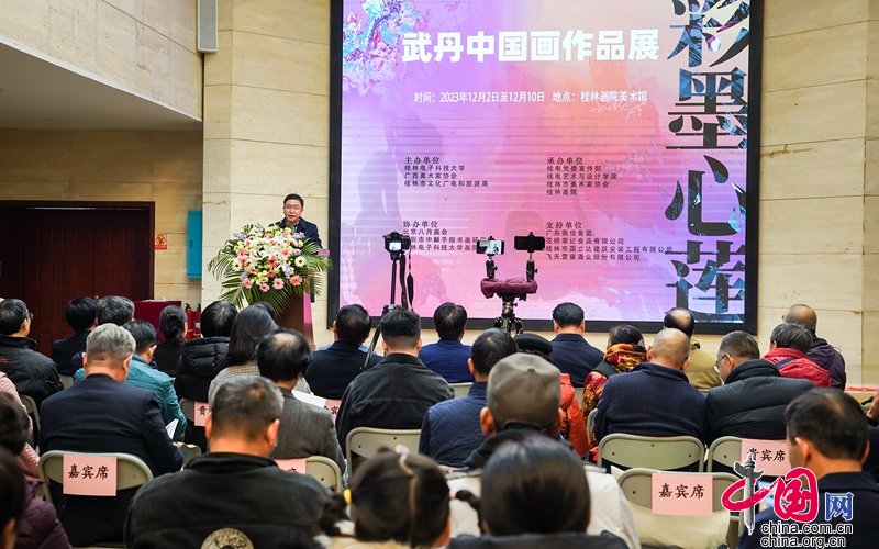2023年12月2日下午,由桂林电子科技大学、广西美术家协会、桂林市文化广电和旅游局共同举办的“彩墨心莲·武丹中国画作品展”在桂林画院美术馆开幕。桂林市人大常委会副主任、市总工会主席徐锋,市政协副主席汤桂荔,桂林电子科技大学党委副书记聂慧、副校长周娅、副校长常亮,以及各地市的领导嘉宾、区内外的艺术家、媒体朋友,桂电师生代表共200余人参加画展开幕式。