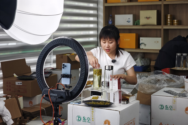 为了解决茶叶的销售问题,长三角黄金芽交易市场内每天都会开展直播,数据显示,2023年以来,东亭乡共享茶仓助农存储销售茶叶约6万斤,为广大茶农增收3000余万元,目前共享茶仓已成为东亭乡茶产业特色名片,为广德黄金芽茶的产业振兴、加快发展绿色农业、盘活农村经济、推动乡村振兴发挥着重要的贡献。