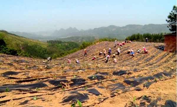 近百位村民在山岭上热火朝天的播种五指毛桃。周洁摄