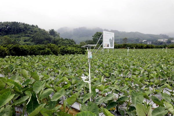 初夏时节,光照和煦,雨水充沛,在广西荔浦市茶城乡茶香社区金洞屯的荔浦芋种植示范基地里,芋苗正长得旺盛,挨挨挤挤,满眼绿意。基地里气象监测、土壤监测、病虫害监测等各种各智能监测设施正要守护着芋苗茁壮成长。