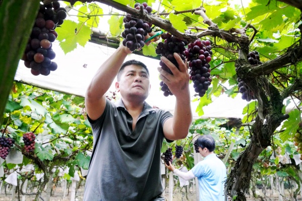 “这季光景好,老天帮忙,管理也提上去了,葡萄不仅样子漂亮,味道更是甜!”果园负责人申艳飞穿梭在藤蔓间,正组织果农抓紧晴好天气采摘分拣。他笑容满面地介绍成果:“亩产2000斤左右,按市价算,每亩增收稳稳过万元。”作为村中致富带头人,他巧妙利用“线下采摘+线上订单”双轨并行,将这份新鲜的甜蜜送往四面八方。