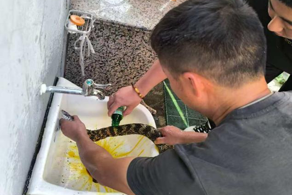 见状,王道奇立刻放下手中的农具,没有贸然靠近。他先退到两米外的安全距离,仔细观察蛇的状态,确认蛇没有明显外伤,也没有攻击人的意图后,立刻拨打了富家村社区电话。“喂,社区吗?我在水东桥山林里,发现一条蛇被网缠住了,麻烦你们派懂行的人来处理下,别让它伤着也别让人碰到它。”