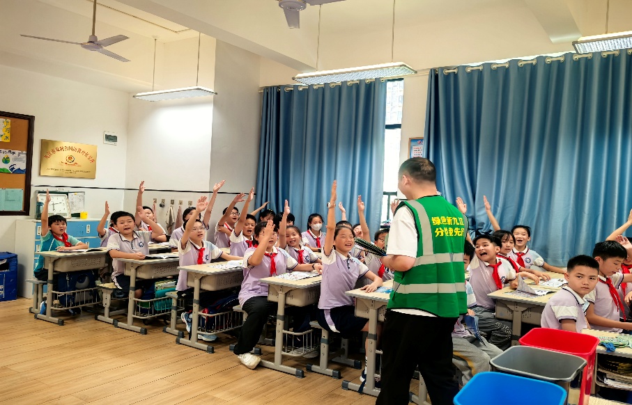 活动伊始,九江市八里湖新区垃圾分类工作人员走进校园,为红星班的少先队员们带来了一堂生动的垃圾分类知识课。工作人员通过通俗易懂的语言,详细讲解了垃圾分类的标准、方法及重要意义,引导队员们认识到垃圾分类对环境保护和资源再利用的重要性。课堂上,互动问答环节精彩纷呈,队员们踊跃举手,积极参与,现场气氛热烈。