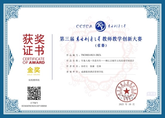近日,2025年第三届东方创意之星教师教学创新大赛四川赛区结果揭晓,成都银杏酒店管理学院设计艺术学院院长孙传宝、张康老师带领学生团队,凭借作品《竹象入境·形意共生——柳江古镇竹文化民宿空间设计》斩获省赛金奖,成功入围全国总决赛。