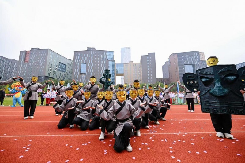 运动会方阵在学生自主设计的吉祥物“美师宝”——一只象征“美视”与“师一”合璧、力量与勇气汇集的狮子的引领下,依次走过主席台,开幕式现场瞬间化身为流动的巴蜀文化长廊。