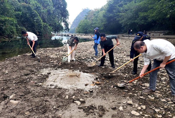 漓江是大自然恩赐桂林的一块瑰宝,爱护漓江、保护漓江是我们每一个桂林人的光荣使命。10月29日,叠彩区城管局(漓管办)组织执法力量会同漓江保护志愿者们对前期非法挖宝人留下的大量坑洞进行回填。大家挥锹铲土、不辞辛劳,经过4个多小时的连续奋战,漓江蚂蝗洲附近河床已恢复原貌。