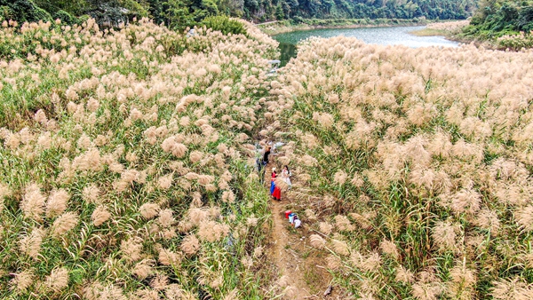 从空中俯瞰,盛放的芦花如波如浪,为大地铺上了一层梦幻的白色地毯,层层叠叠的芦苇连绵成片,蜿蜒的乡村小路和清澈的河流穿梭其间,与连绵的青山共同构成了一幅层次丰富的生态画卷。近看,一簇簇洁白的芦花在阳光下泛着柔和的光泽,随风轻盈舞动,沙沙作响。湖面上,游船悠然划破平静的水面,三两游客悠闲乘船,从另一种视角欣赏这片芦花胜景。两岸的苇浪如白色帷幕缓缓移过,舟行景移,带来"船在江上走,人在画中游"的独特体验。