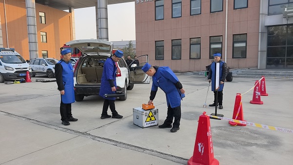 这次演练模拟以安阳县区域内一辆货车发生交通事故,车上疑似载有一枚Ⅳ类Co-60放射源,初步判定属一般辐射事故为模拟背景。下午15时30分,辐射事故发生后,公安人员立即对现场进行了交通封锁,卫健委安排120车辆在事故现场待命,消防车辆迅速响应,同步向生态环境部门报告事故详情。接到报告后,市、县生态环境部门立即启动四级应急响应,成立了现场指挥部,辐射科、应急办、执法大队等专业人员携辐射检测仪、铅防护装备、应急铅罐等设备火速赶赴现场。抵达后,各小组按职责分工迅速展开行动:一是现场勘察组利用无人机机动性能好、操作方便、高清无死角的优势,对事故现场开展高空巡航勘察作业,现场勘察组通过显示屏幕观测摄像头实时传回的多角度、全方位、近距离画面,详细排查事故现场实事情况,为后续进入的监测人员提供了安全保障;二是监测组手持环境级辐射监测仪,身着辐射防护服,佩戴个人计量报警仪,对事故现场周围进行辐射剂量初步监测,警戒组根据监测剂量结果放置反光锥,确定控制区划分辐射控制区范围,放置辐射警示标识,防止无关人员受到意外照射;三是监测人员手持长杆高量程辐射巡检仪,推动移动式铅屏风对现场进行仔细搜索监测,发现辐射高剂量区域后,对区域内杂物逐一监测,现场发现辐射异常,有1枚疑似放射源。表面最大剂量为80微戈瑞每小时,监测组携带核素识别仪对确定的放射源进行核素识别;四是污染处置组开车驶入控制区外,两名工作人员将放射源移入暂存箱内,并对暂存箱表面进行了伽玛辐射剂量监测和表面污染监测,确定无泄漏后将暂存箱抬放到车箱内安全送至暂存库;五是监测组用伽玛辐射监测仪和表面污染仪再次对事故现场进行监测,经监测现场辐射水平已处于正常的环境本底水平,监测组撤离到安全区域。经二次监测,现场的辐射水平处于正常的本底水平,未对周边环境造成放射性污染,此次突发辐射事故,已经全部处理完毕,建议解除应急响应状态。整个过程衔接顺畅,各环节处置严格遵循预案标准,充分展现了参演队伍的专业素养与快速响应能力。(郝红利、刘志强)