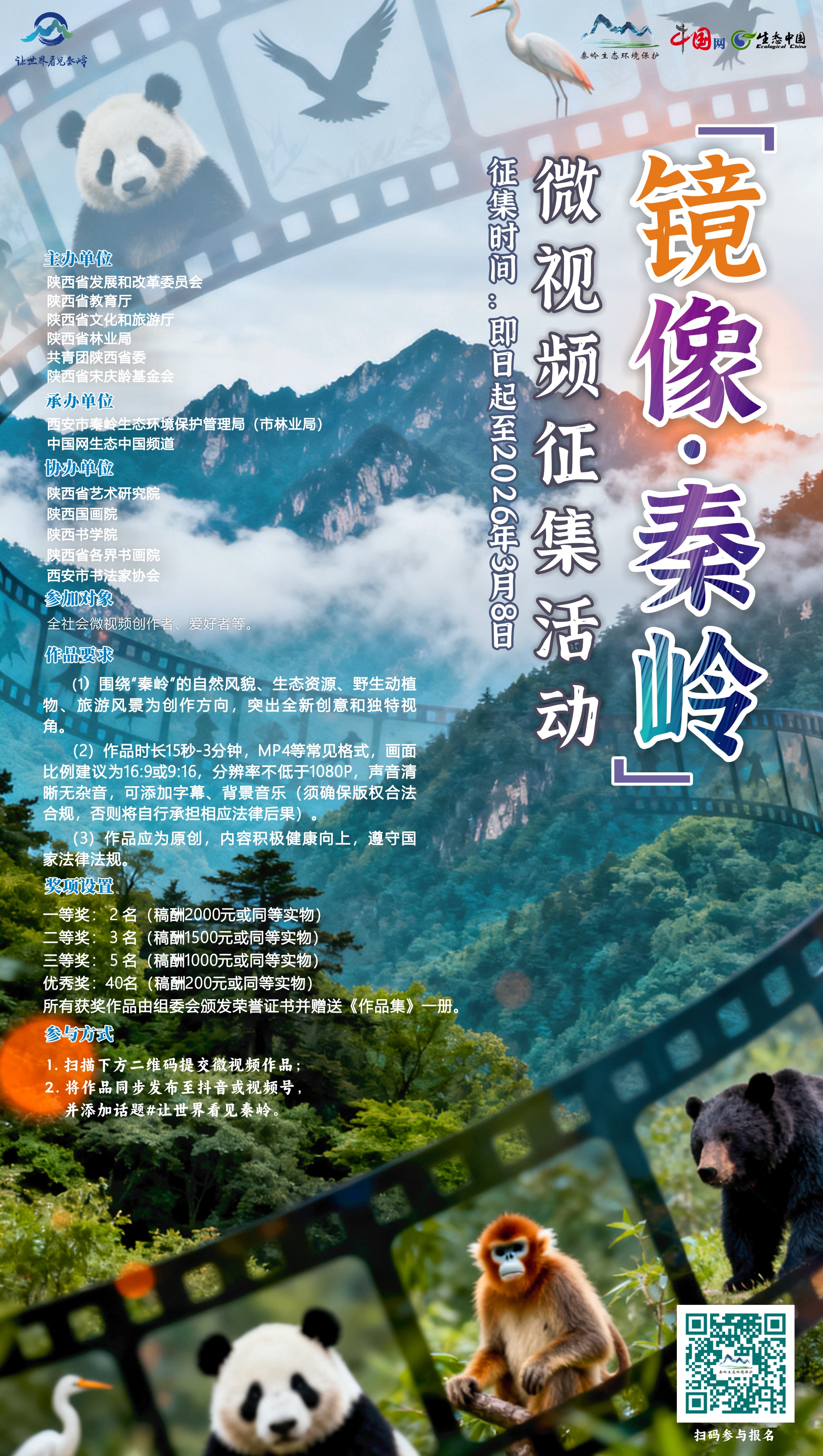 为进一步彰显秦岭保护工作的卓越成效,陕西省发展和改革委员会、陕西省教育厅、陕西省文化和旅游厅、陕西省林业局、共青团陕西省委、陕西省宋庆龄基金会共同携手,开展以“让世界看见秦岭”为主题的秦岭生态环境保护文化宣传系列活动。秦岭生态环境保护微视频征集活动作为本次系列活动的重要组成部分,现面向全社会征集微视频作品,具体事宜公告如下: