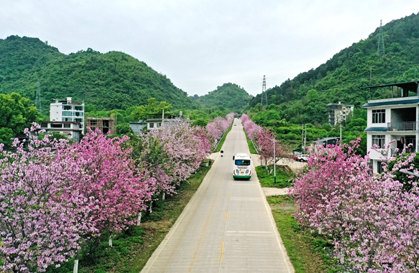 阳朔县城环城路道路两侧盛开的紫荆花。钟玲丽/摄