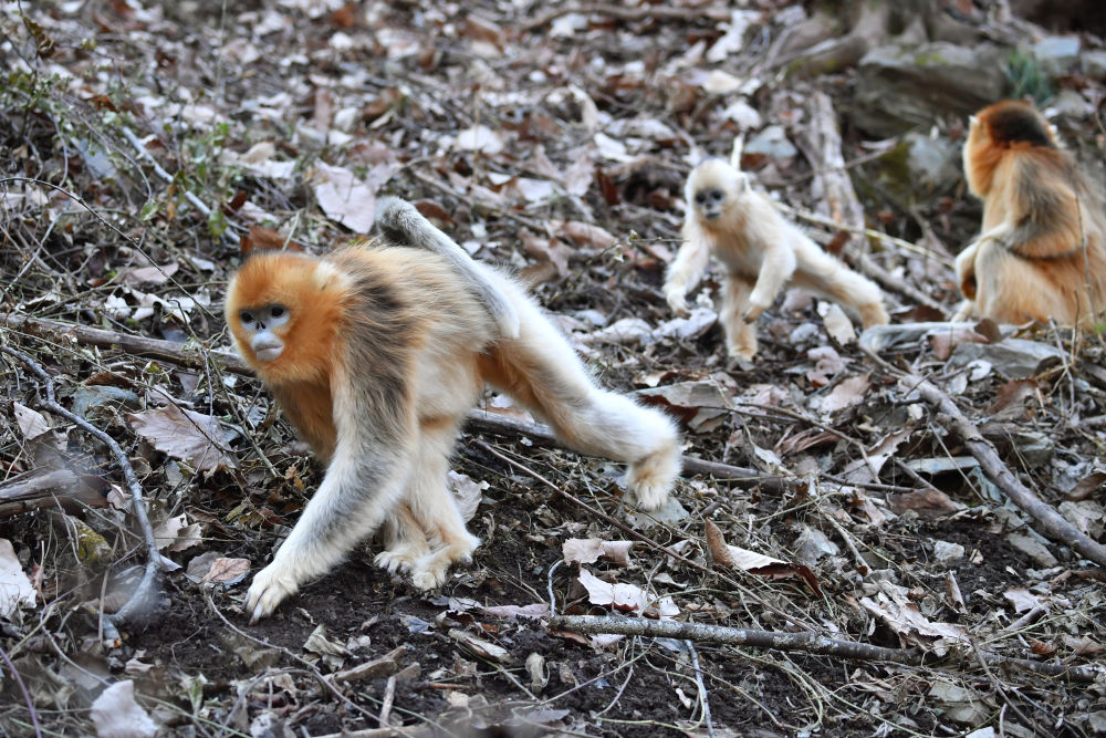 12月11日,金丝猴在陕西周至国家级自然保护区玉皇庙金丝猴监测基地活动。新华社记者邵瑞摄