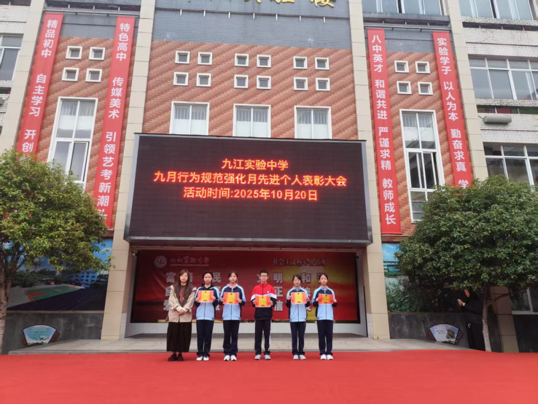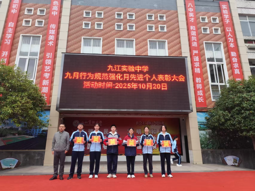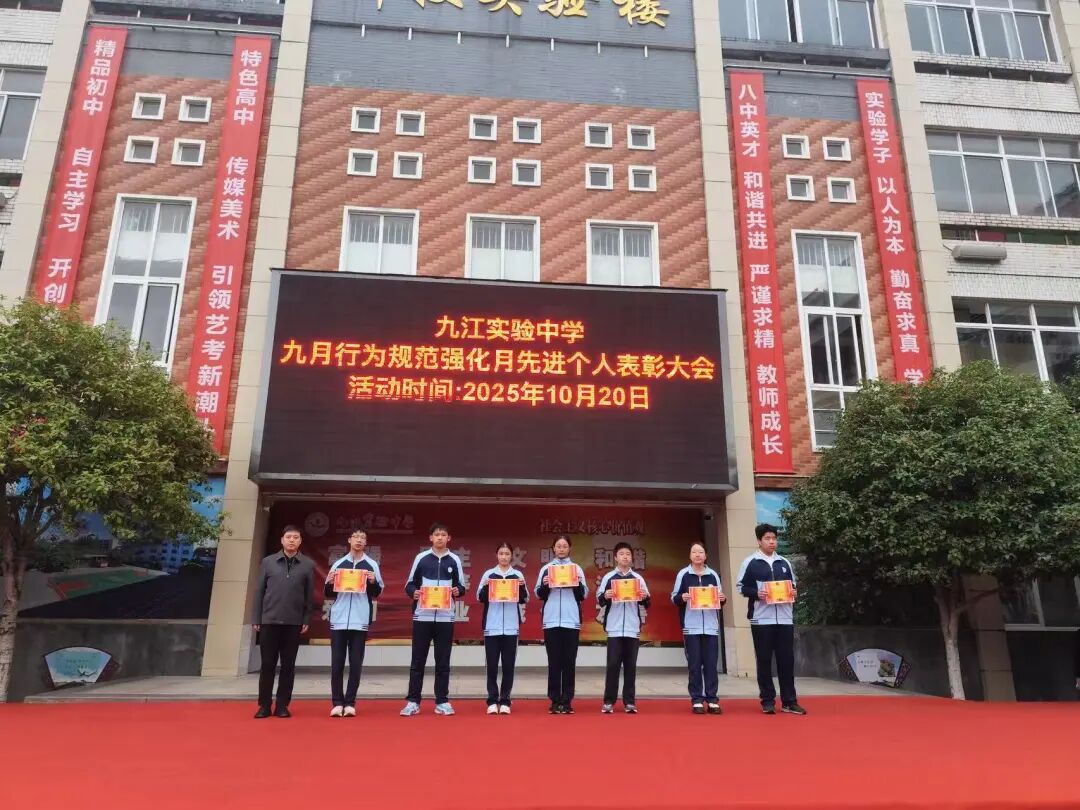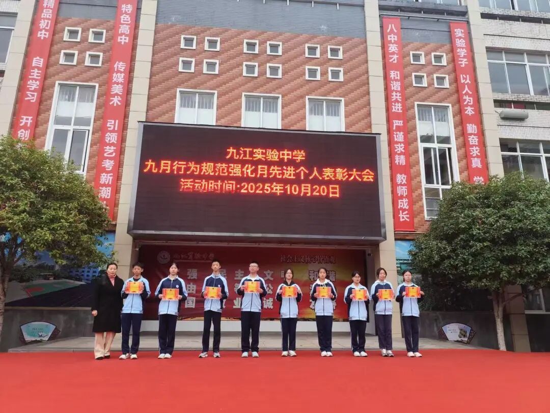 在行为规范强化月先进个人表彰环节,学校政教处对各年级表现优异的学生予以表彰。九江实验中学校长熊菁等校领导先后为获奖同学颁奖,现场掌声不断,榜样力量深入人心。