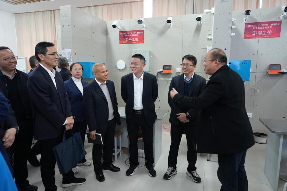 交流中,中国电信九江分公司党委委员、副总经理熊克山分享了校企全方位联动在公益服务、党建引领、人才培养等领域的支持举措;“向东班”班长向东同志分享了以劳模工匠赋能职业教育的实践,并介绍其统筹省市劳模资源开展故事分享与引育的成功经验。与会人员实地察看了校企共建的“双带头人”书记工作室、向东班学徒示范服务窗口、红色物联向东班、智慧家庭工程师实操认证中心、天翼云网实训中心等教学实训场所,详细了解实训平台运行与人才培养成效。