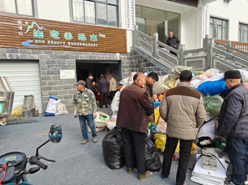 12月10日清晨,安徽省黄山市歙县深渡镇绵潭村的生态美超市门口早已热闹非凡,村民们三三两两提着破旧衣物、塑料瓶、纸板箱、泡沫盒等废旧物品,有序排队等候——每月10日、20日、30日的“垃圾兑换日”如约而至,这已经成为当地村民生活中最接地气的“环保约定”。
