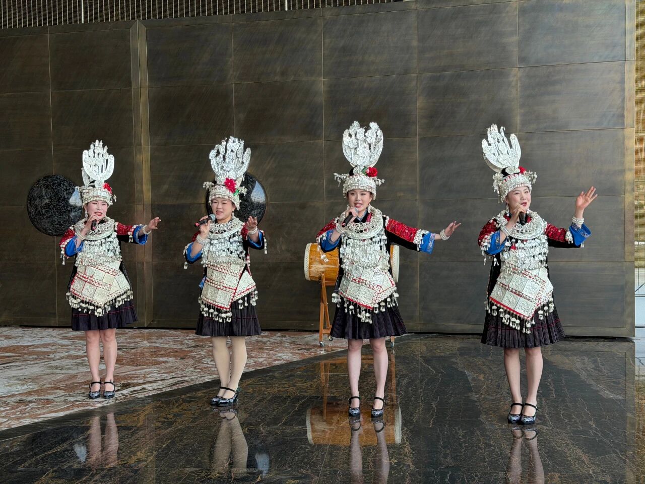 舞台之上,台江县苗疆艺术团的演员们身着银饰盛装,带来了一场场极具民族风情的表演。欢快悠扬的苗族飞歌宛若天籁之音,响彻剧院;铿锵有力的反排木鼓舞节奏明快,热情四射。传统艺术与现代审美在此碰撞交融,精彩的演出不仅展现出苗族文化的独特魅力,更引得现场观众纷纷驻足欣赏,掌声此起彼伏。
