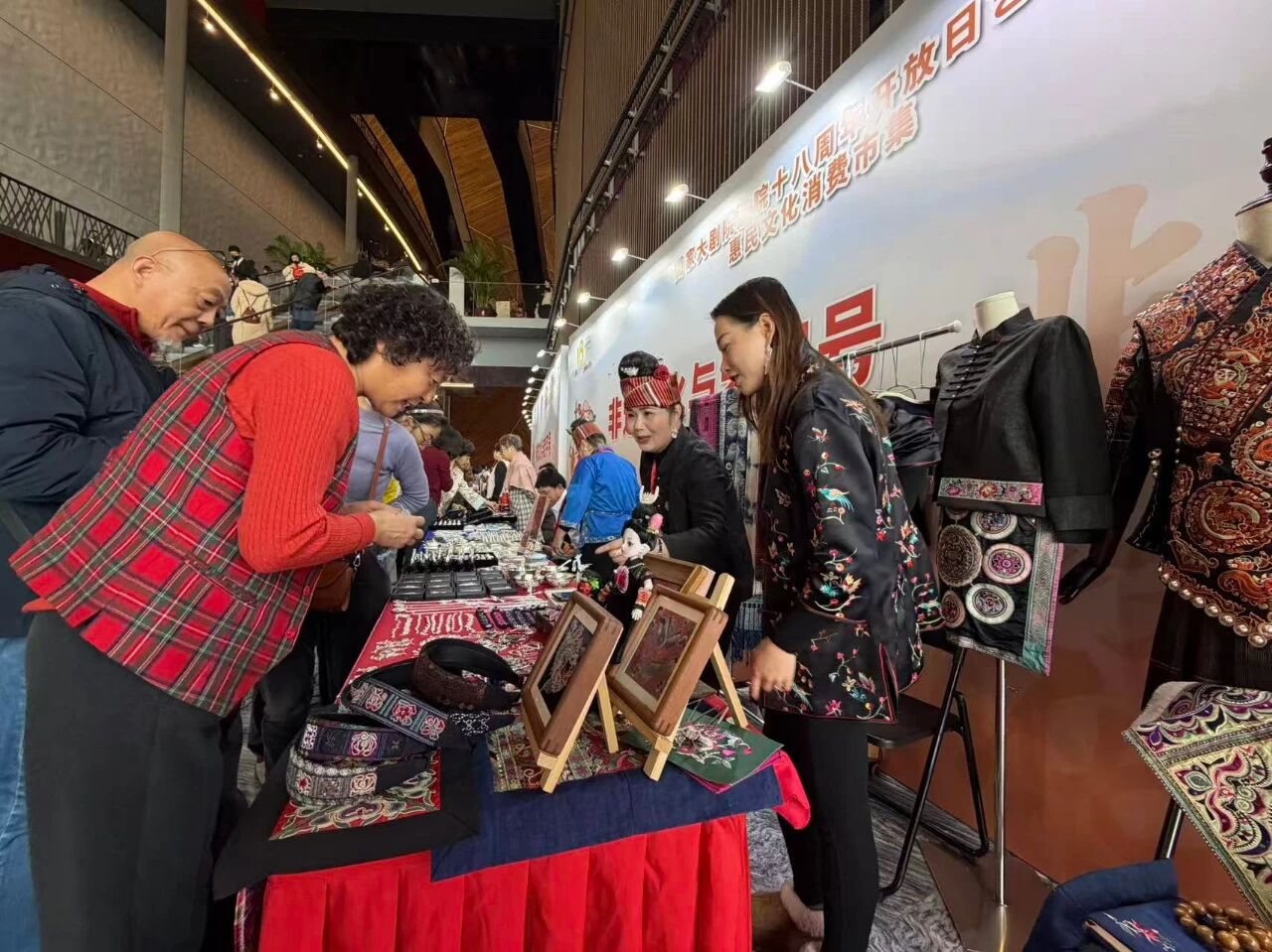 与此同时,惠民文化消费市集内人头攒动。苗族银饰、苗绣、蜡染等非遗手工艺品琳琅满目,巧夺天工的工艺让观众赞叹不已;“村BA”系列文创产品创意十足,将赛事活力与民族元素巧妙融合。特别值得一提的是,台江县以国家大剧院艺生活logo为核心,融合龙、蝴蝶、花鸟等苗族传统纹样,采用苗绣“绘”制了《苗韵艺华章》,以此祝福国家大剧院建院十八周年;苗人匠心文化创意有限责任公司更联合国家大剧院,打造出涵盖5个品类20余款的系列文创产品,吸引众多首都观众争相选购,让大家在近距离观赏与体验中,感受台江非遗的传承魅力与文创产业的创新成果。
