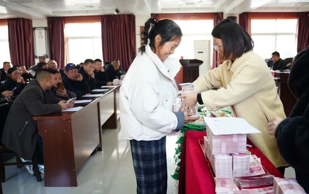 当天下午,发放仪式有序进行。工作人员仔细核对信息,将一笔笔现金递到制种大户和合作社代表手中。现场掌声阵阵,农户们接过款项后认真清点,脸上洋溢着灿烂的笑容。