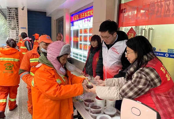 “天气这么冷,快喝碗热粥暖暖身子!”1月26日,理工大学社区党支部携手共建单位的党员志愿者带着热腾腾的腊八粥,走上街头,送到环卫工人手中,为寒冬里坚守岗位的环卫工人送去关怀与敬意。