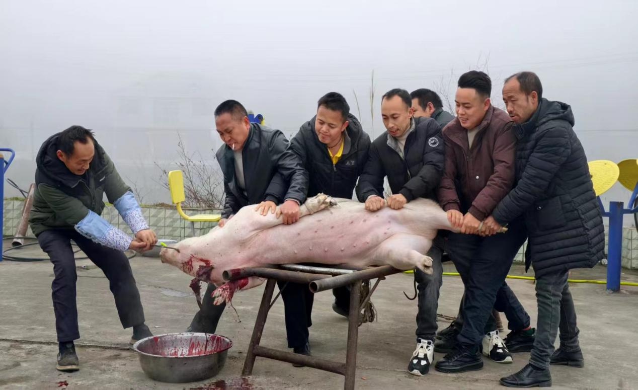 天色微明,寨子便醒了。炊烟袅袅,柴火香里裹着烫猪特有的暖香。村口处,几个后生正把一头肥壮的年猪抬上案板—这是寨里五十八位在外游子的共同心意:每人一百元,聚成五千八百元,只为请全寨老少共享一顿地道的“泡汤宴”。